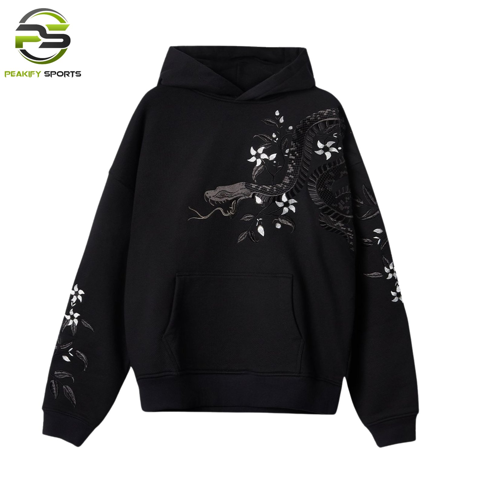 Upgrade your streetwear game with this premium black oversized hoodie. Featuring intricate snake and white floral embroidery across the chest and sleeves, this hoodie combines edgy aesthetics with high-quality comfort. Made from heavyweight cotton-fleece for a cozy, durable fit.
