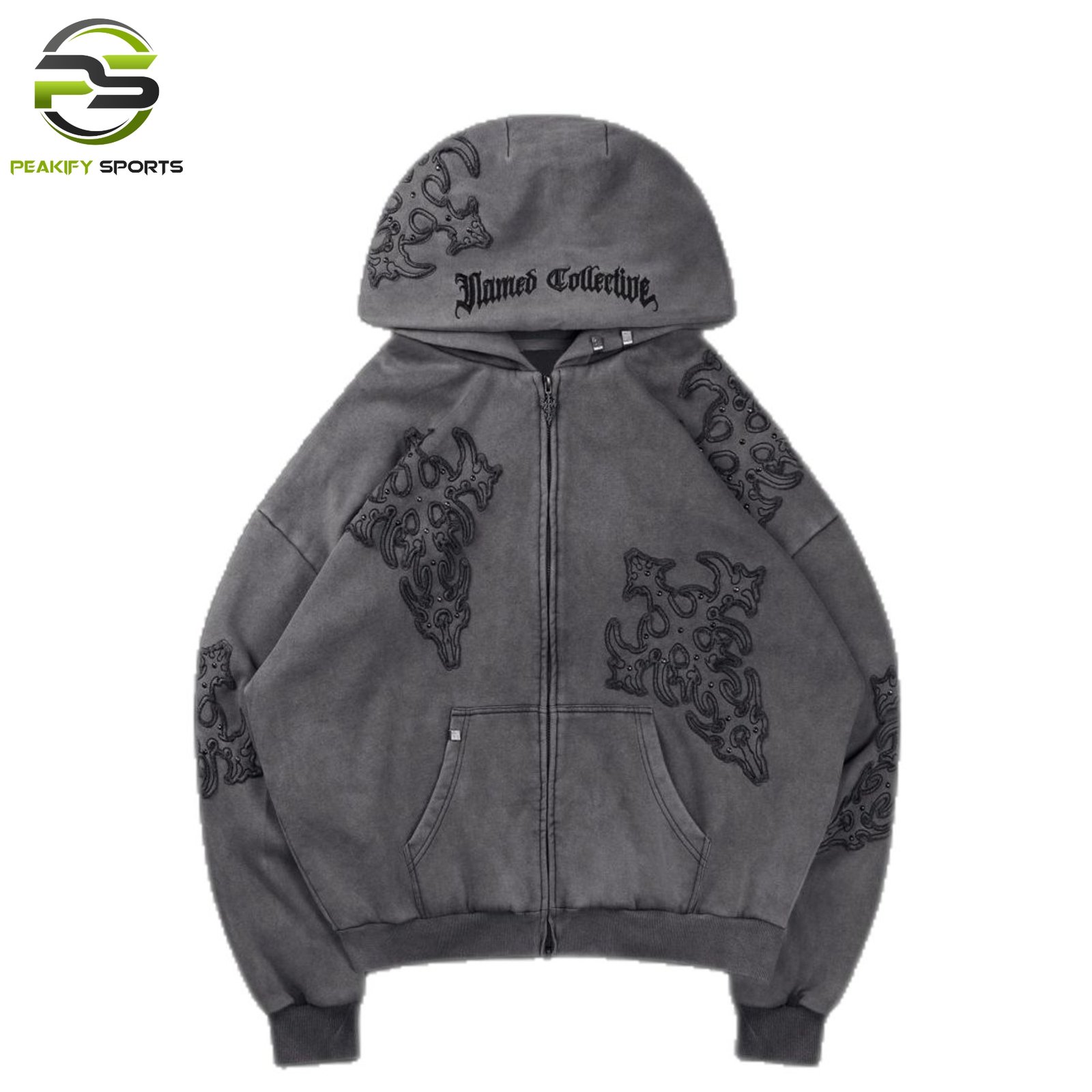 This charcoal grey zip-up features bold, raised gothic-style appliqués on the body and hood. Designed with a boxy, modern fit and “Named Collective” inspired embroidery. The thick, washed fabric ensures warmth and a structured silhouette.