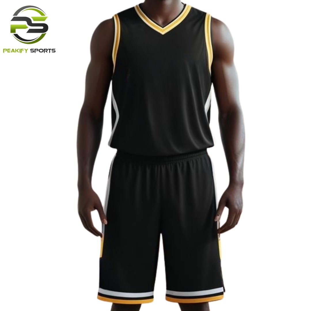 A premium men’s basketball kit in black with gold and white accents, featuring a deep V-neck jersey and high-mobility performance shorts. Manufactured by Peakify Sports for elite team performance and style.