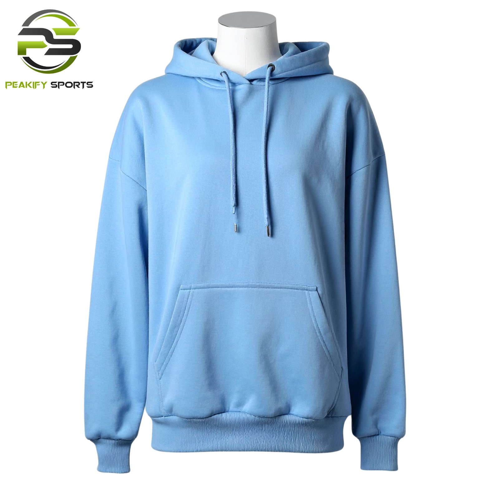 A premium sky blue oversized hoodie featuring a drop-shoulder design, spacious kangaroo pocket, and high-density ribbed finishes. Manufactured by Peakify Sports for the perfect balance of luxury comfort and street-ready style.
