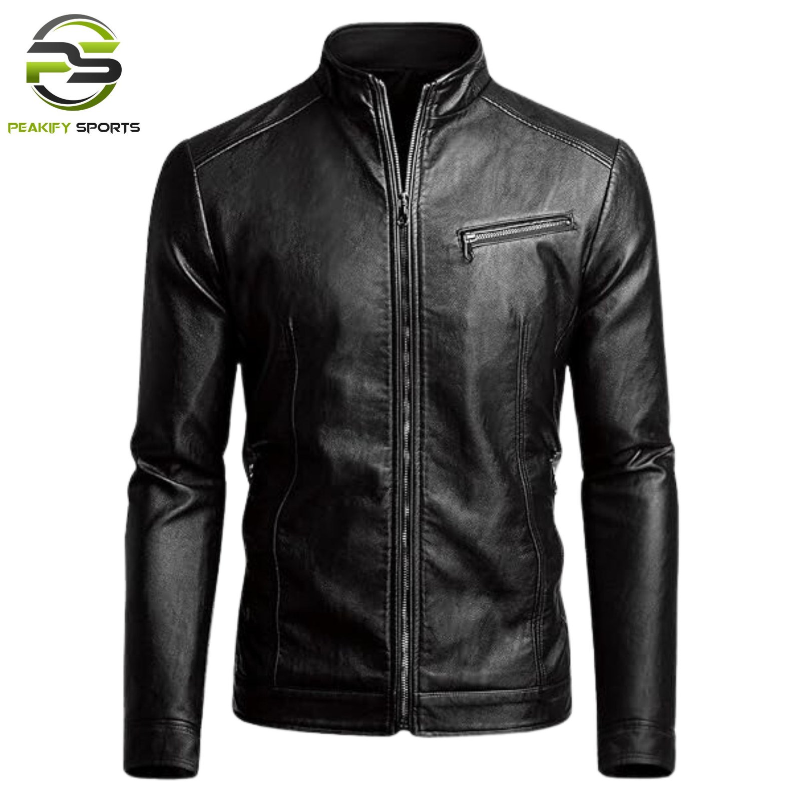 A minimalist men’s black leather racer jacket featuring a sharp stand-up collar, streamlined utility pockets, and a modern tailored fit. Manufactured by Peakify Sports for timeless luxury and elite durability.