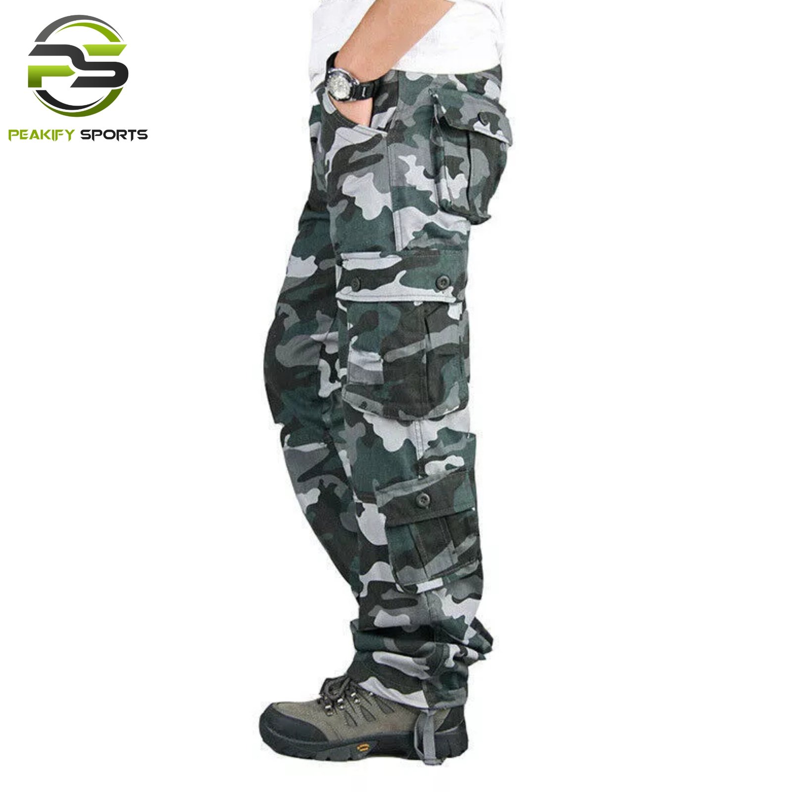 Rugged Forest Camo tactical pants featuring multiple high-capacity cargo pockets, reinforced stitching, and adjustable ankle ties. Manufactured by Peakify Sports for superior outdoor performance and industrial-strength utility.